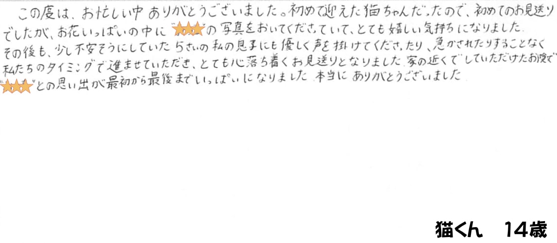 家の近くでしていただけたお陰で、★★★との思い出が最初から最後までいっぱいになりました。本当にありがとうございました。