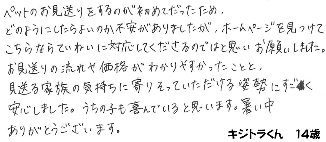 お見送りの流れや価格がわかりやすかったことと、見送る家族の気持ちによりそっていただける姿勢にすごく安心しました。うちの子も喜んでいると思います。