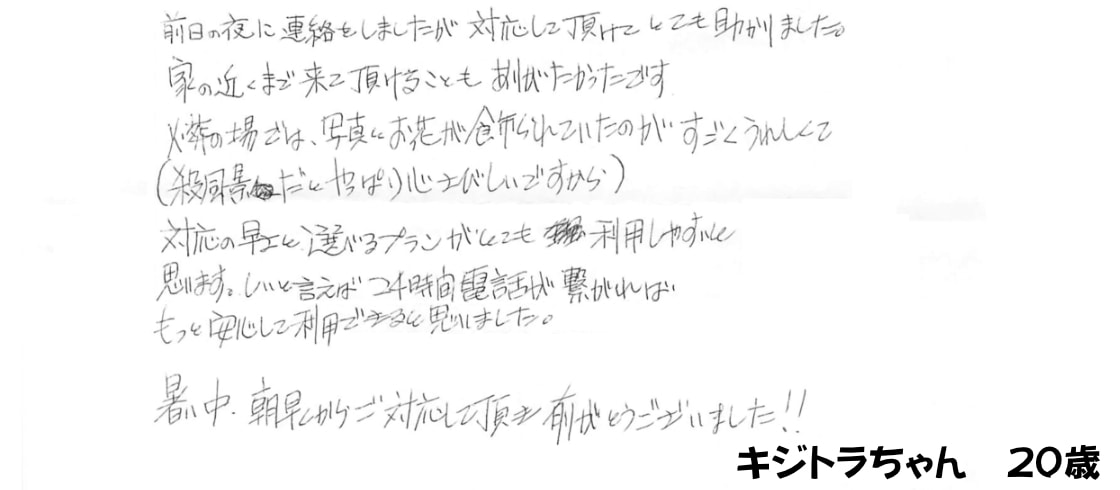 お葬式までのメールのやりとりもわかりやすく親切で安心できました。大事に育てた子を安心して旅立たせることができ、親子共々感謝しています😊