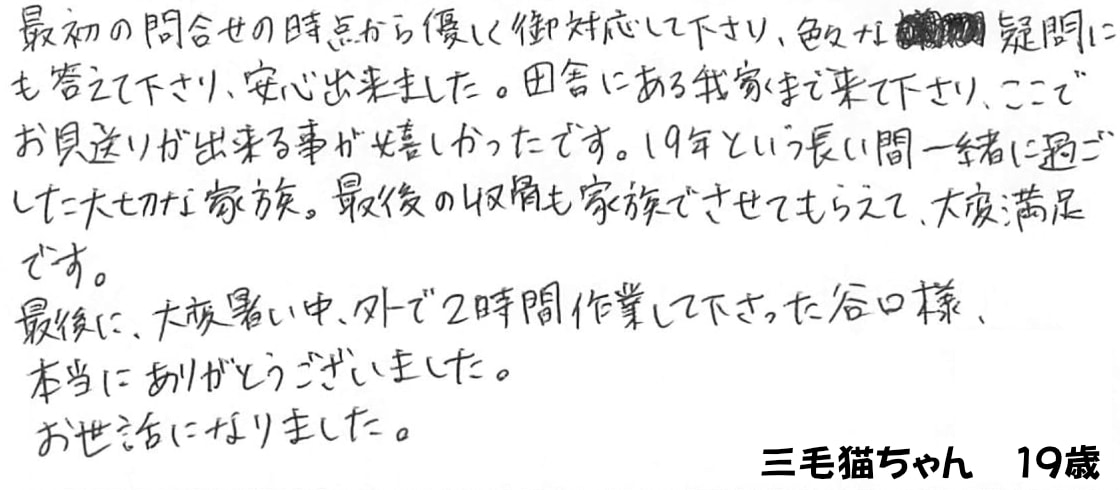 最初の問合せの時点から優しく御対応して下さり、色々な疑問にも答えて下さり、安心出来ました。田舎にある我家まで来て下さり、ここでお見送りできる事が嬉しかったです。19年という長い間一緒に過ごした大切な家族。最後の収骨も家族でさせてもらえて、大変満足です。