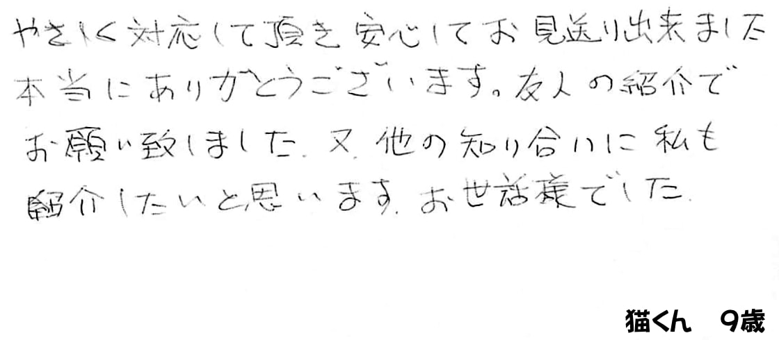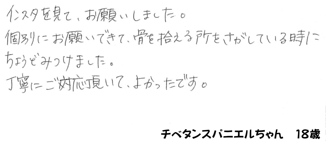 最初の問合せの時点から優しく御対応して下さり、色々な疑問にも答えて下さり、安心出来ました。田舎にある我家まで来て下さり、ここでお見送りが出来る事が嬉しかったです。19年という長い間一緒に過ごした大切な家族。最後の収骨も家族でさせてもらえて、大変満足です。