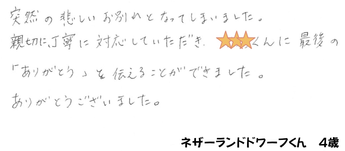その後も、少し不安そうにしていた5さいの私の息子にも優しく声を掛けてくださったり、急かされたりすることなく私たちのタイミングで進ませていただき、とても心落ち着くお見送りとなりました。家の近くでしていただけたお陰で、★★★との思い出が最初から最後までいっぱいになりました。