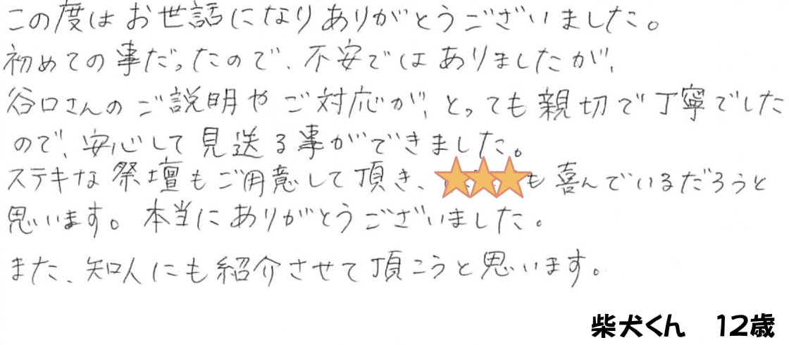 担当の方がとても親切で丁寧で、こちらの思いを色々とくんでもらい、家族みんなで大好きな家族の一員と最後のお別れをすることができました。「星の方舟」さんにお願いをして本当によかったです。